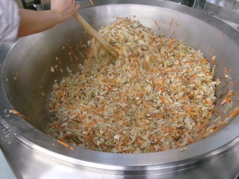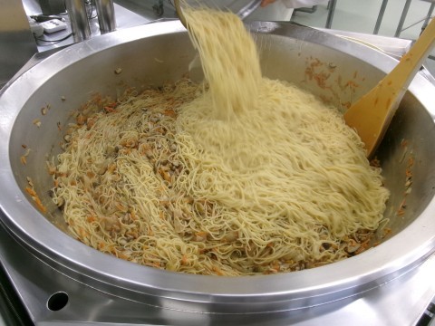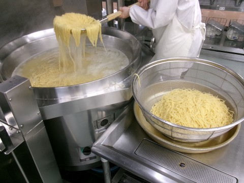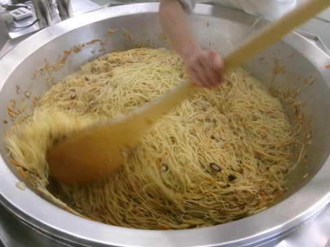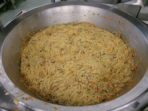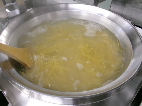 スパゲティは別の釜で茹でてから,あらかじめ作っておいた具材と絡めます。