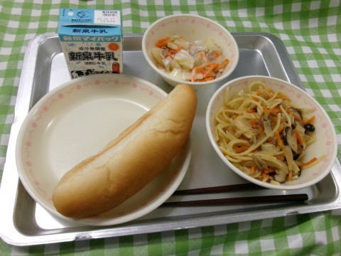 きのこには、おなかの調子をととのえる食物せんいが多くふくまれています。今日のスパゲティには、しいたけ・しめじ・えのきたけが入っています。