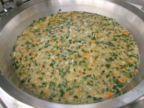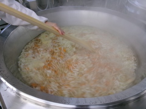 スパゲティは別の釜で茹でてから,あらかじめ作っておいた具材と絡めます。