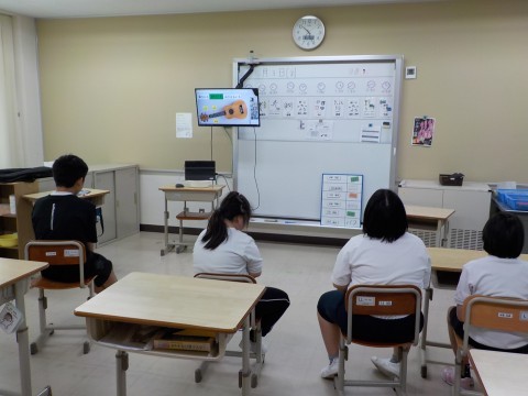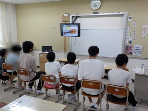 今日はいつも活動場所で使用している音楽室が使用できなかったので、教室でTeamsを活用したオンライン授業をしました。学年で初めて試みでしたが、みんな意欲的に参加することができました💮画面から聞こえてくるピアノの音に合わせて、ウクレレを弾く活動を楽しみました♪