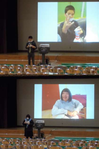 中学部全員で集まり、2学期にがんばったことなどを発表し、冬休みの過ごし方について、話を聞きました。