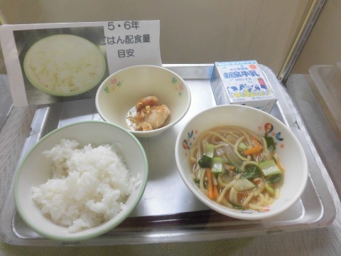 今日の給食では、鶏のから揚げをオーブンで蒸し焼きにし、白ねぎ・にんにく・