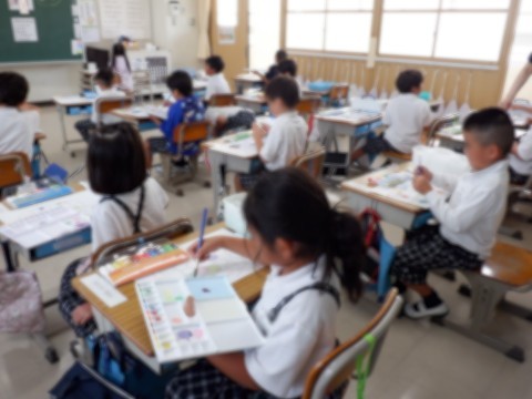 1年生は図工の時間です。絵の具の色を混ぜて,いろいろな色を作っています。