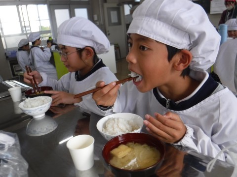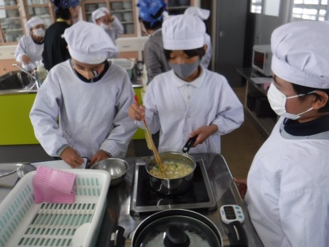 2・3時間目、5年生は家庭科の学習で調理実習をしました。メニューは、ごはんとみそ汁です。