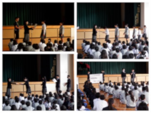 1時間目,学園集会を行い,自転車博物館コンクール,はとぶえコンクールの表彰とバトミントン部の新人戦の個人と団体の表彰を行いました。