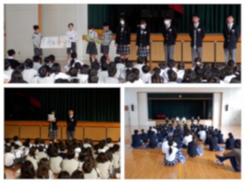 生徒会からは,11/8(土)に参加した,大阪府中学校生徒会サミットで発表した内容をみんなに報告してくれました。