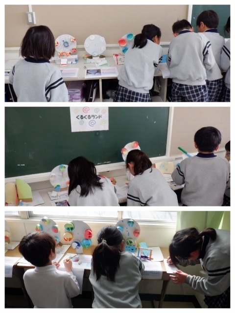 3年生は,図工で作った「くるくるランド」の作品を鑑賞しています。