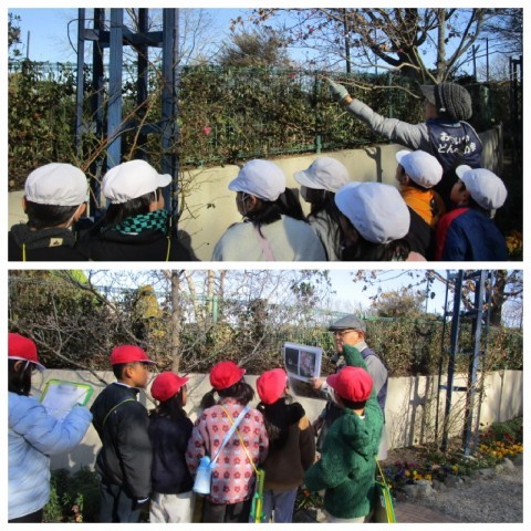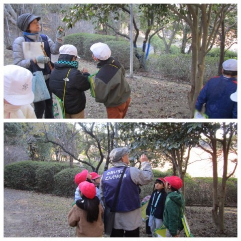 午前中,2年生は,「おおいずみ・どんぐりの会」の方々に来ていただき,大泉緑地で冬芽の観察をしました。