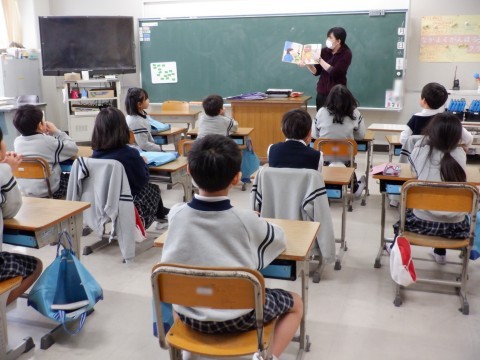 2年生は図書の時間です。もうすぐ節分なので,鬼が登場するお話を読み聞かせしてもらっています。