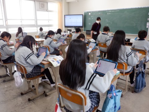 6年生の社会では,アメリカについて学習し,みんなが調べたことをタブレットで共有しています。