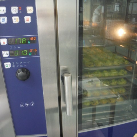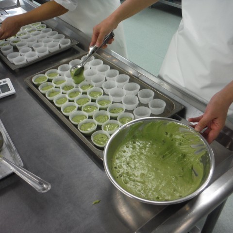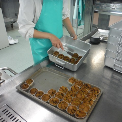 給食室で小麦粉・砂糖・牛乳などを混ぜ合わせ,カップにいれてオーブンで焼いています。