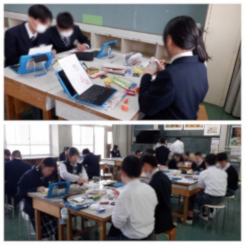 8年生は美術です。和菓子のデザインを考え,紙粘土で制作しています。粘土の色を混ぜながら,デザイン通りの色にするため苦心して取り組んでいます。