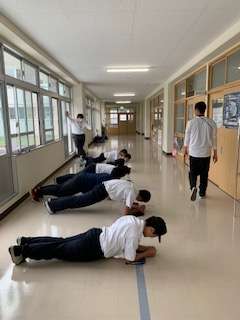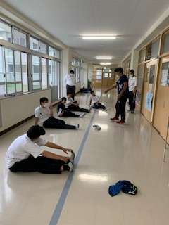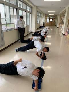 雨でグラウンドが使えないため、今日は校内でトレーニングを行いました。