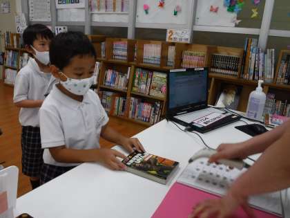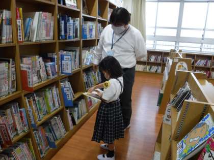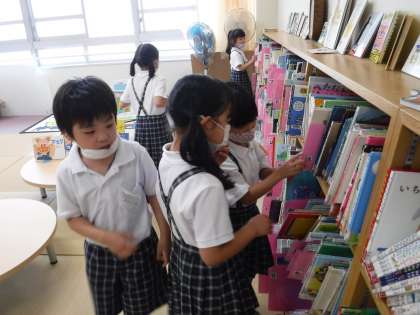 4時間目に,初めて図書室へ行きました。好きな本を選んで,一冊借りました。