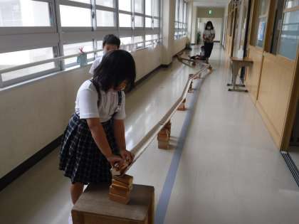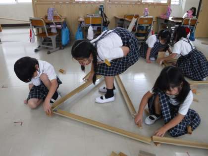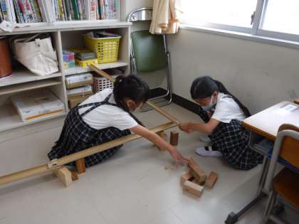 2時間目は,お楽しみの「ピタゴラスイッチ」作りです。5つのグループに分かれて,最後に全部をつなげることにしました。