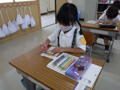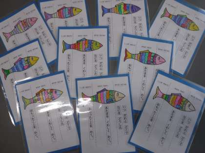 1時間目に,作文の時に使う「お魚作文カード」を作りました。作文の型の見本カードです。これを見ながら,作文に挑戦していきます。