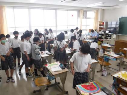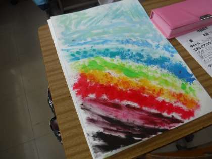 スパッタリングやグラデーションを生かした友だちの作品を見て「この線は、楽しさや幸せがにじみ出てる!」や「太陽の中にスパッタリングの青が入っていて、悲しさも表現されているね。」など、表現したことを捉え、素晴らしい感想がたくさん出ていました!