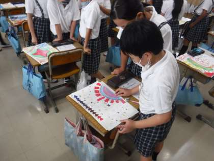 今日は、先週に描いた「心のもよう」を、友だち同士で鑑賞しました。