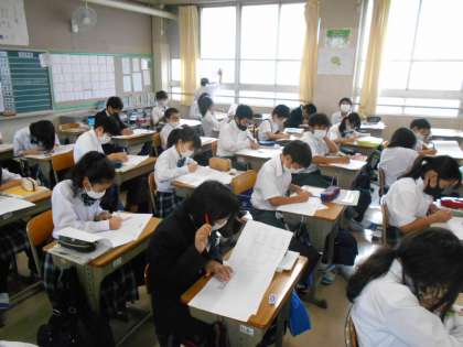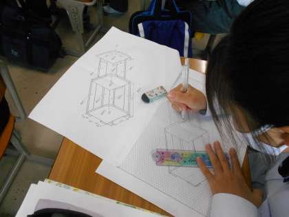 本立てを制作するため、設計図を書いています。難しいかと思ったら、生徒はスラスラ線を引いていきます。お見事!!