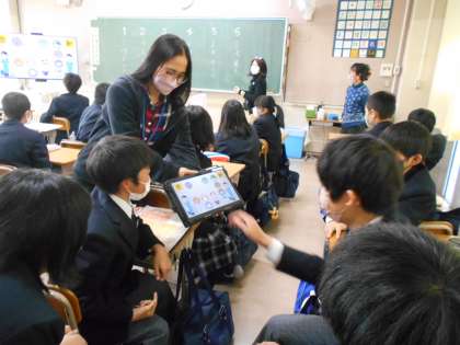 グループにわかれて,とても楽しそうに英語の学習をしていました。例えば,「What did you do last night?」(あなたは,昨夜は何をしましたか?)という質問文に対して,グループで協力しながら,答えの文章を英語で書いて,発表をしました。