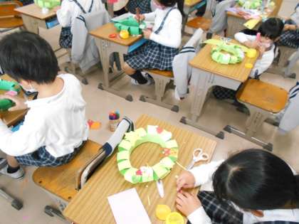 クリスマスリースを色紙で制作中。かわいいリースが出来ています。