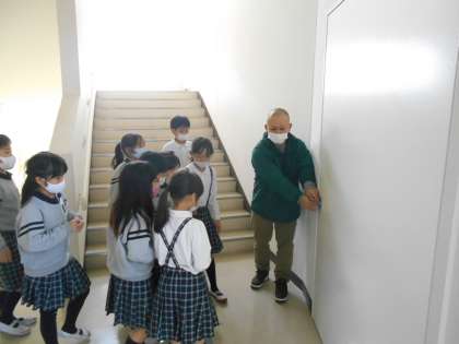 防災の学習です。日頃は、開くことがない防火扉に子どもたちはワクワク。防火扉の出番がないことを願います。