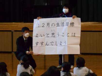 生徒指導の先生からは,12月の生活目標は,「よいと思うことはすすんでしよう!」でした。