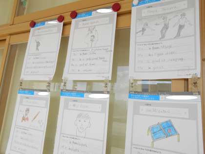 「行きたい国の旅行案内」や「好きなスポーツ選手の紹介」など、英語で文章を書きました。その国のお勧め料理や名所、スポーツ選手の良いところなどが書かれています。絵でも上手に表現しています。
