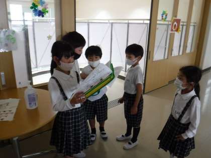 普段は入れない教室をのぞいたり,1年生の質問に2年生が頑張って答えたりするなど,仲良く交流することができました。
