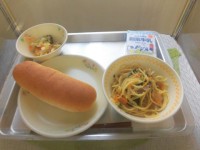 本日のメニュー ミニコッペパン 牛乳 じゃこと小松菜のスパゲティ 花野菜のマヨネ...