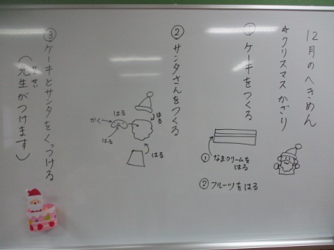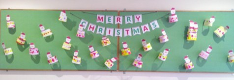 先日のひまわりタイムで作ったクリスマスケーキを飾りました。クリームたっぷりのケーキや,いろんなフルーツでカラフルなケーキ,友だちのケーキと合わせて2段の豪華なケーキなど,かわいいケーキがたくさんできました。個性あふれるサンタさんたちもとってもかわいいので,学校に来られた際はぜひご覧ください。