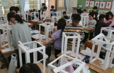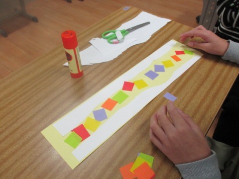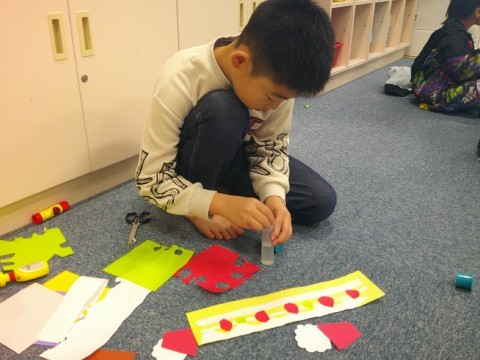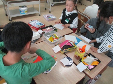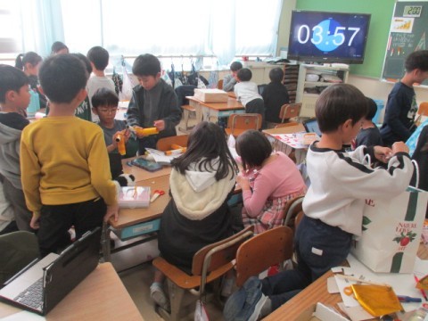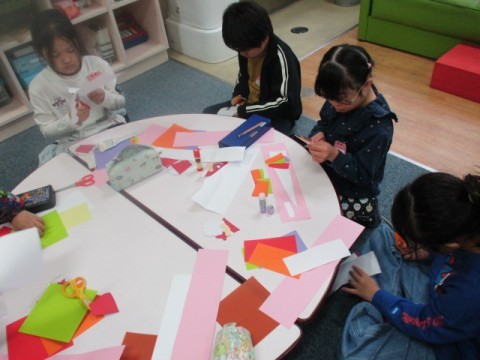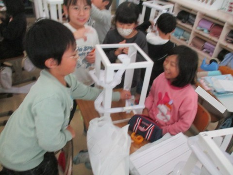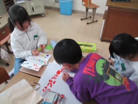 1年生を迎えて行う「おもちゃランド」の準備をしています。ポスターを書いたり景品を作ったりしながら,お店の人としてお客さんに遊びを楽しんでもらえる創作活動に取り組んでいました。