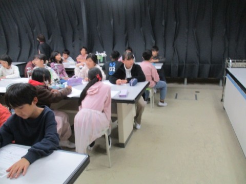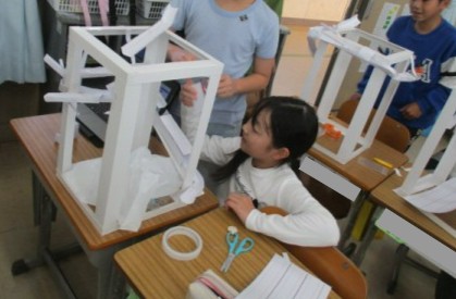 ビー玉がレールの上をコロコロ転がっていく装置を作っています。何度もビー玉を転がして転がり方の観察をしながら,イメージするたのしい転がり方になるように,工夫と改善を繰り返していました。