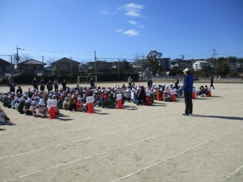 避難訓練を行いました。今回は、休み時間に地震が発生し、その後火災が起きたという想定での訓練です。地震発生の放送が流れたあと、子どもたちは今いる場所でそれぞれ身を守る行動をとりました。ろう下にいた子はその場でしゃがみ込み、運動場で遊んでいた子は中央に集まり、教室にいた子は机の下に潜り込みました。休み時間ですから、先生がすぐそばにいるとは限りません。それでも、自分で判断して行動する姿が見られました。「運動場に避難しましょう」という放送が流れると、子どもたちは、急いで運動場に集合しました。いつ起こるかわからない災害。休み時間でも、授業中でも、自分の命を自分で守れるように、今日の訓練を通して、改めてその大切さを学習しました。