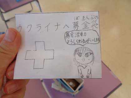 児童会『募金活動』 公開日 2023/07/11 更新日 2023/07/11 学校記事 今日からウクライナへの募金活動が始まりました。たくさんの人が手作りの募金袋に入れて来てくれました。本当にありがとうございます。 引き続き明日も行っています。ご協力をよろしくお願いします。