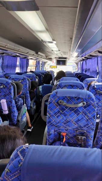 高速を降り、まもなく学校です。 予定より早く学校に到着します。 5年生の下校時刻も予定より早くなります。