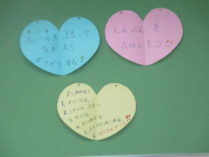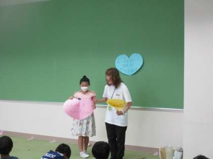後片付けした新聞紙は袋に詰めて、ボール回しゲームのボールにしまいした。音楽に合わせてお隣に回していき、止まった時に持っていた人が「好きな○○」を発表しました。