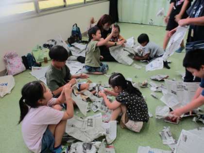 今日は新聞紙を使って遊びました。はじめに説明してもらった順番に、新聞紙をちぎったりまいたり片づけたりと、なかなか普段はできないような活動をしました。みんなとても楽しそうに、新聞紙をすくってはばらまいていました。