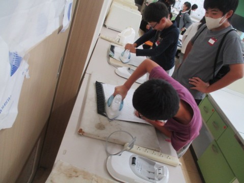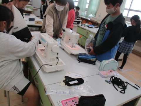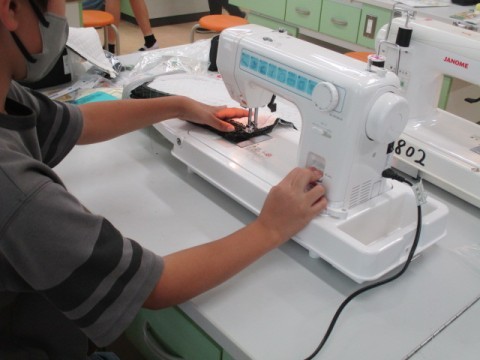 ナップサックづくりです。アイロンがけもしっかりと行ってミシンでいねいに縫っています。完成したナップサックは修学旅行で使う予定です。