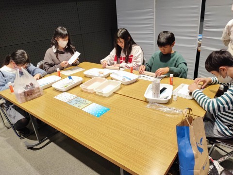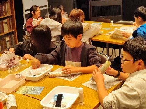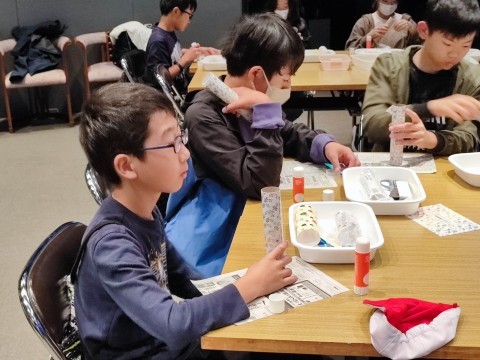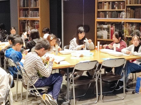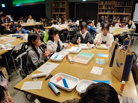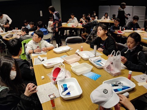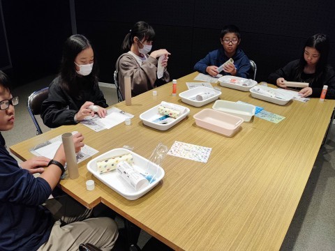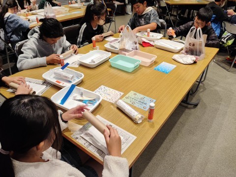 6年生 +6 真珠とビーズで作る「万華鏡づくり」です。作り方のレクチャーを受けながら作業しています。細かな作業です。