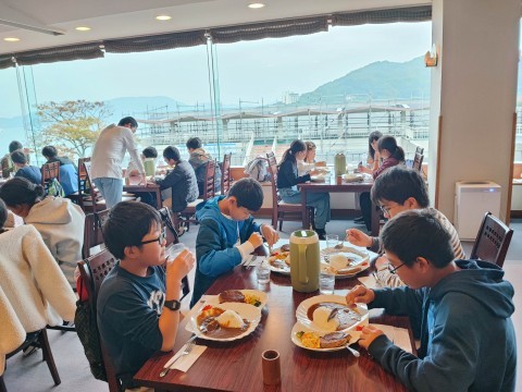 6年生 昨晩は早く寝ました。まだ、眠そうですが体操をして食事に向かいます。雨はまだ降っていません。