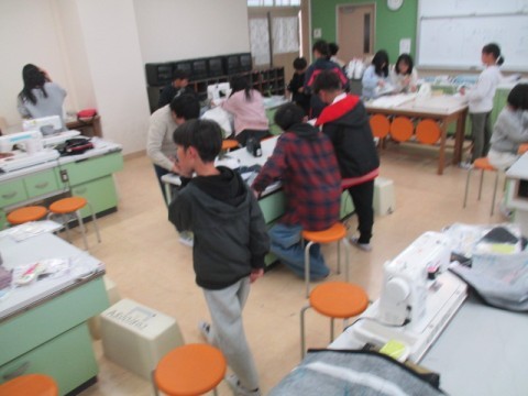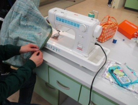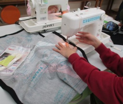 ミシンを使って縫っています。針の動きと布の進み具合をしっかりと見ながら作業をしていました。