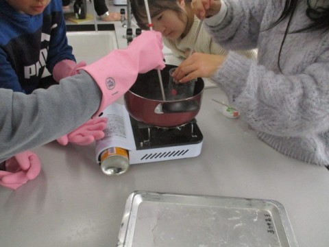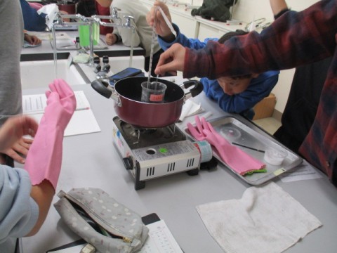 溶かす水の温度を上げたとき、溶ける量に変化があるのかを実験しました。食塩とミョウバンでは溶け方にどのような違いがあるのか、どの班も変化のちがいをしっかりと見ながら観察していました。