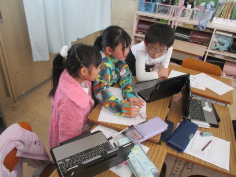 堺市について調べています。グループごとに担当する区を決めて、どのような施設や名所があるかを調べたり、わかったことをワークシートに書いたりしていました。