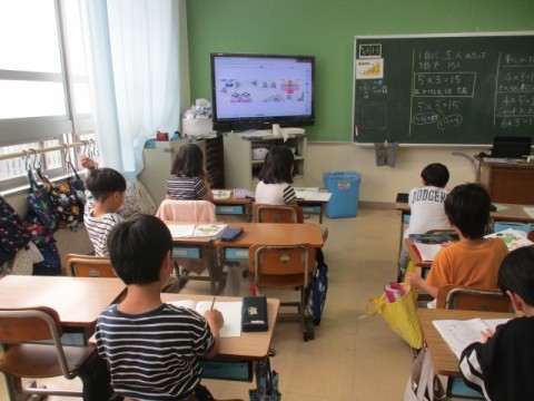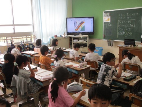 かけ算の学習で、数のまとまりがいくつ分あるのかをイラストで確かめていました。子どもたちは、絵の中の数のまとまりを数えながら、式に出てくる数と比べて考えています。式と絵をつなげて考えることで、かけ算の意味をしっかりと確かめる学習となっていました。