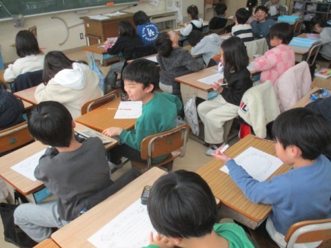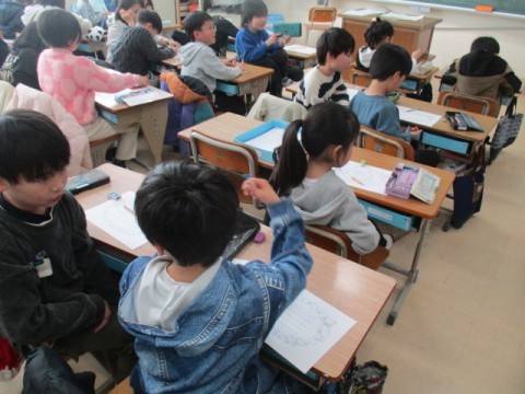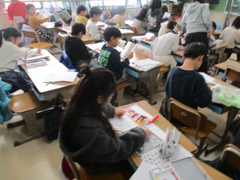 1年生を迎えて行う「おもちゃランド」の準備をしています。ポスターを書いたり景品を作ったりしながら,お店の人としてお客さんに遊びを楽しんでもらえる創作活動に取り組んでいました。