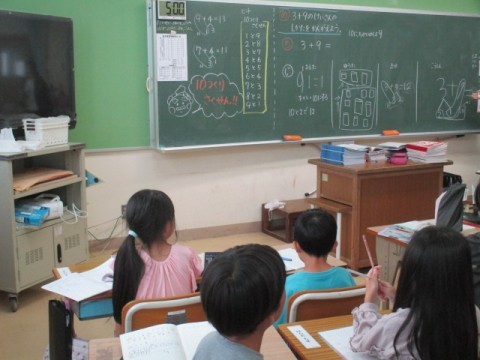 たし算の学習で、10のまとまりをつくって計算する方法を学んでいました。子どもたちは、いくつかのやり方を見比べて、どの方法がわかりやすいかを考えていました。